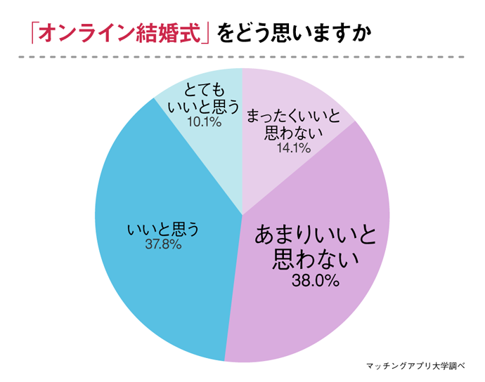 「そこまでしてみんなに祝ってもらいたくない。画面越しは恥ずかしい」(22歳女性)、「実感がわかなそう」(35歳男性)といった意見が目立ち、「オンラインの結婚式はありだと思いますが、自分はしたくないなと思います」(30歳女性)といった独身者の本音が垣間見える結果となりました。