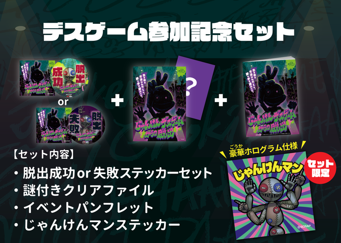 そんな『じゃんけんデスゲームからの脱出』のオリジナルグッズの販売が決定いたしました。リアル脱出ゲームのオリジナルグッズでは欠かせない定番商品「脱出成功/失敗ステッカーセット」や、じゃんけんマンが出す新たな謎 に挑戦できる「謎付きクリアファイル」は、イベントに参加した記念としてお土産にピッタリ。本イベントの制作風景やディレクターインタビュー、じゃんけんマンの声優 中尾隆聖氏のコメントなどが詰まった「イベントパンフレット」も必見です。さらに今回、この3種のオリジナルグッズに加え豪華ホログラム仕様の「じゃんけんマンステッカー」もセットになった「デスゲーム参加記念セット」もご用意いたしました。「謎解きじゃんけん」のゲームマスターであるじゃんけんマンが、どこか見覚えのあるデザインで描かれた特別なステッカー。記念セットでしか手に入らない限定品ですので、ぜひセットでご購入ください。