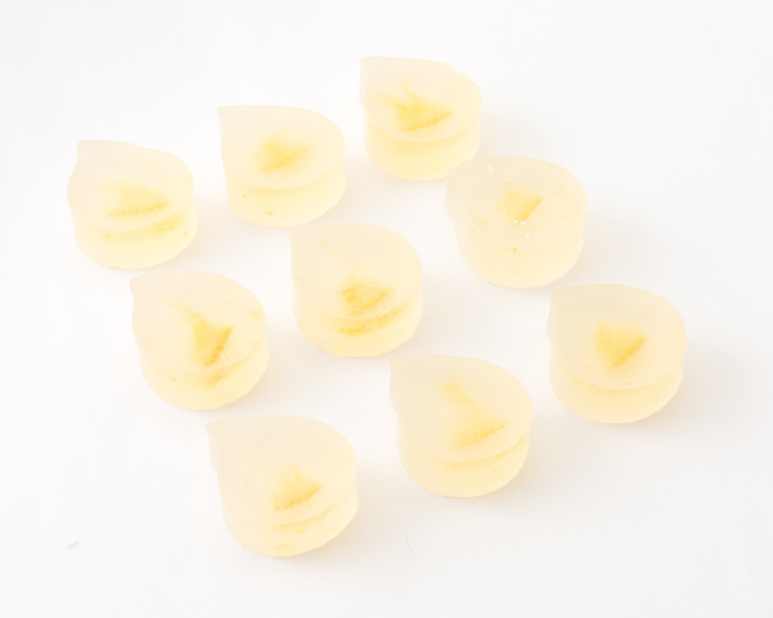 一粒の中に閉じ込められたレモンの果汁・果肉・果皮。自然の酸味と甘さが調和したレモン特有の風味が口いっぱいに広がり、清涼感あふれる爽やかな体験をお楽しみいただけます。暑い夏の日にリフレッシュするのに最適な和菓子です。