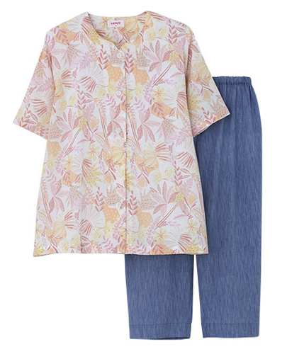 本商品は、「夏の寝るステテコ」をテーマに、ステテコに使われる生地にシボ(細かなシワ模様)があり肌との接触面積が少なく吸汗性と通気性に優れたクレープ(紳士用)や揚柳(婦人用)素材を使用したパジャマです。ボトムはステテコと同じ丈感の7分丈で、トップスは丸首デザインで涼やかな印象に仕上げています。紳士のトップスの背当て部分には汗をよく吸う肌触りのよいパイル素材を使用して背中の寝汗をキャッチ、落ち着いた細幅のストライプ柄と小紋柄をラインアップしました。婦人パジャマは、エキゾチックな柄をボーダー調に組み合わせた爽やかな柄とトレンドのボタニカル柄を揃えました。上下セットでも単品でも使え、リビングでのリラクシーウェアや夏のお昼寝にもおすすめのアイテムです。