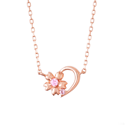 オープンハートモチーフに作品の世界観から桜を取り込み、桜色のストーンをセット。エンドチャームは櫛を象りました。