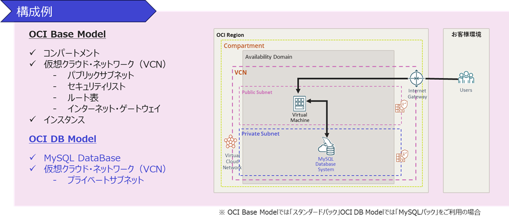 本モデルは、OCI Base Modelと組み合わせることで、OCI上でMySQL Databaseを利用できる環境をご提供しております(OCI Base Modelとの組み合わせは必須となります)。