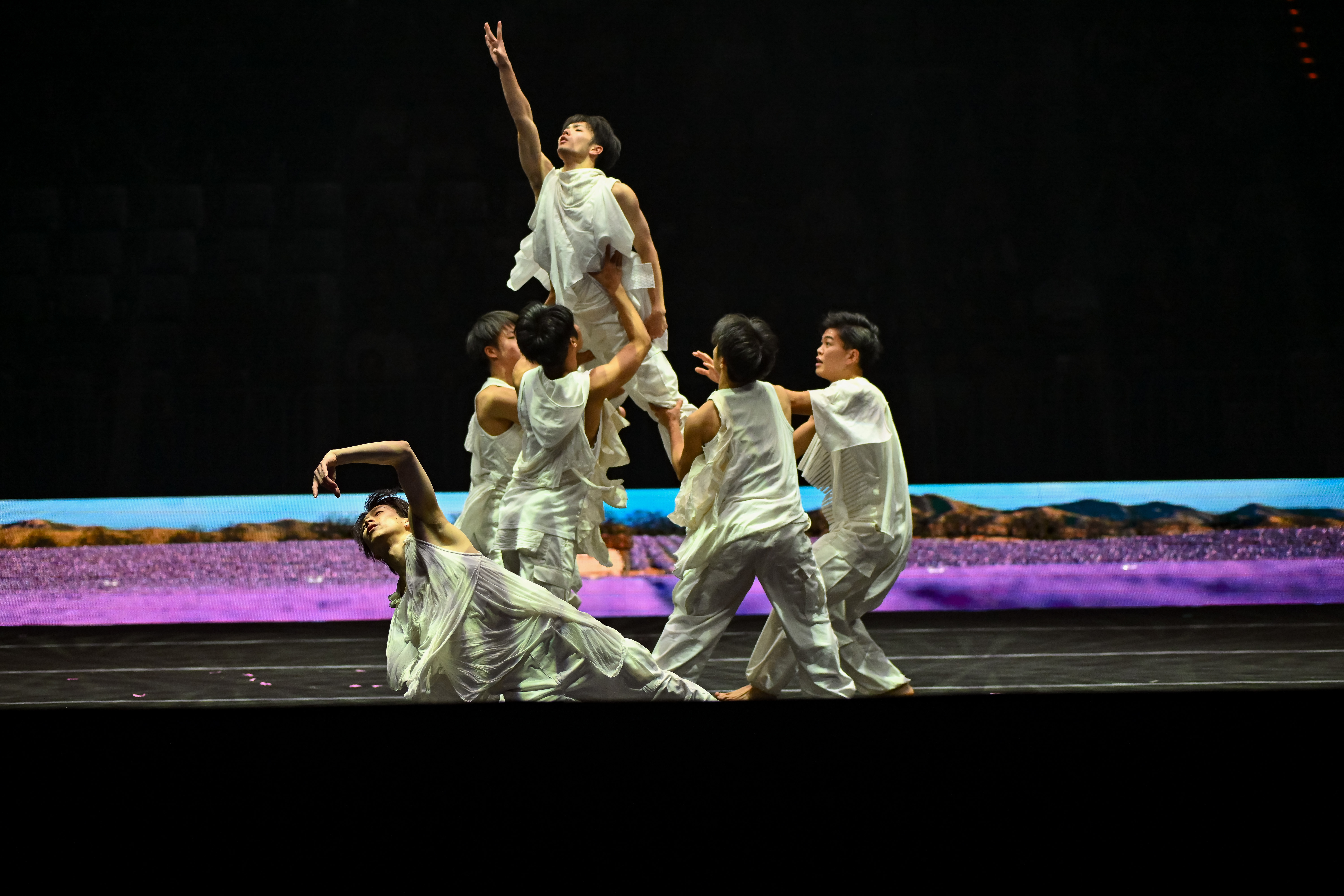 演目は新体操の団体演技と創作ダンスを中心とした集団演技の二つ。集団演技の振付は「乃木坂46」などを手掛けるSeishiroさんが担当してくれ、メインダンサーはBLUE TOKYOの大舌恭平さん(井原高校出身)が務めました。