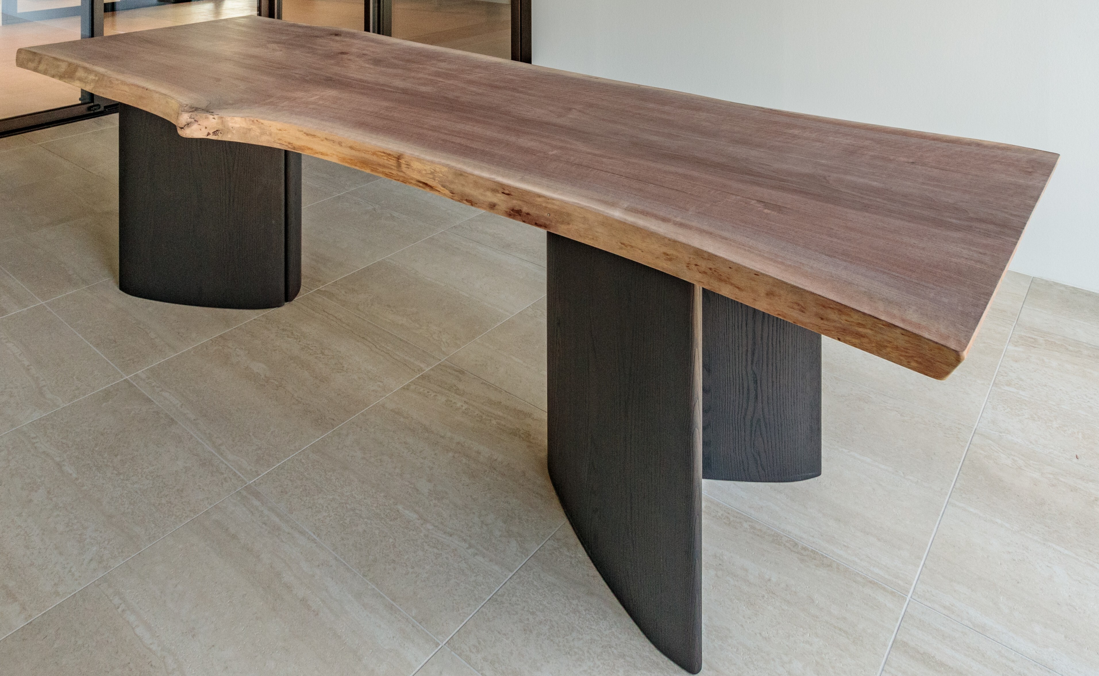 ウォルナット一枚板を用いたテーブル天板です。素材本来の色合いを生かしたソープフィニッシュで仕上げ、木の素材感をそのまま残しました。建築デザイナー・成ヶ澤氏デザインの脚部との組み合わせにより、一点物のダイニングテーブルとして提案します。同じ杢目は唯一無二であり、ショールームでは素材そのものを体感することができます。