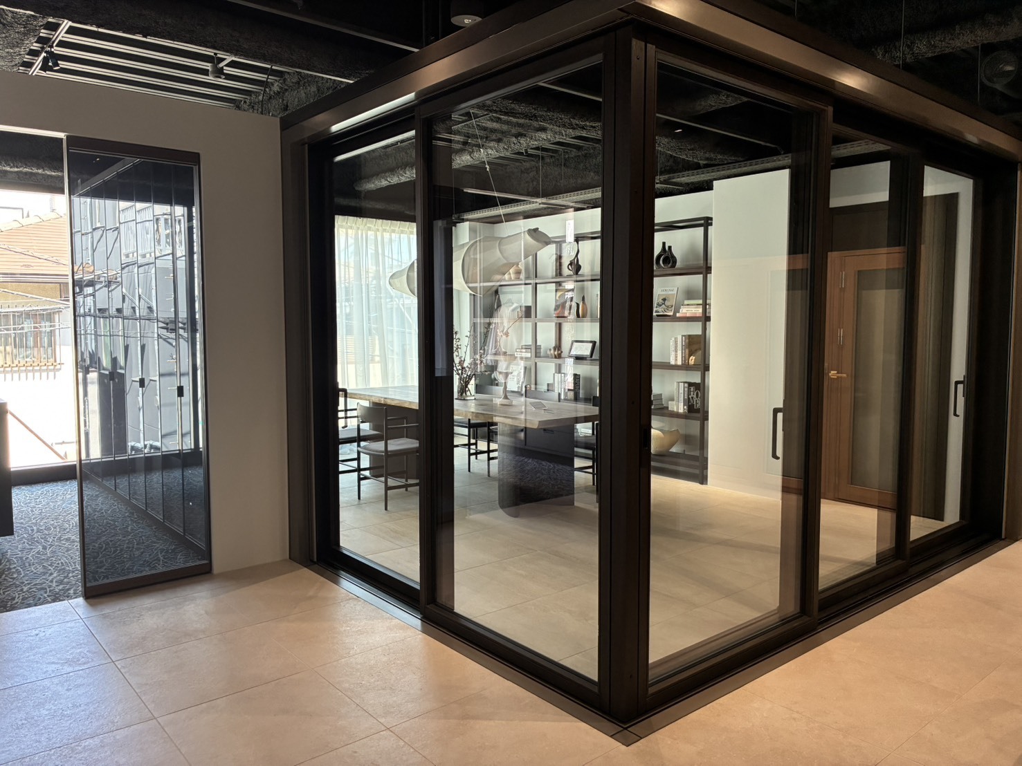 框の見える幅を極限まで削ぎ落とした木製サッシです。コーナーにスリム框を用いた仕様は国内でも希少な構成です。今回のショールームには、国内での採用事例がない新樹種「レッドグランディス」を採用しました。