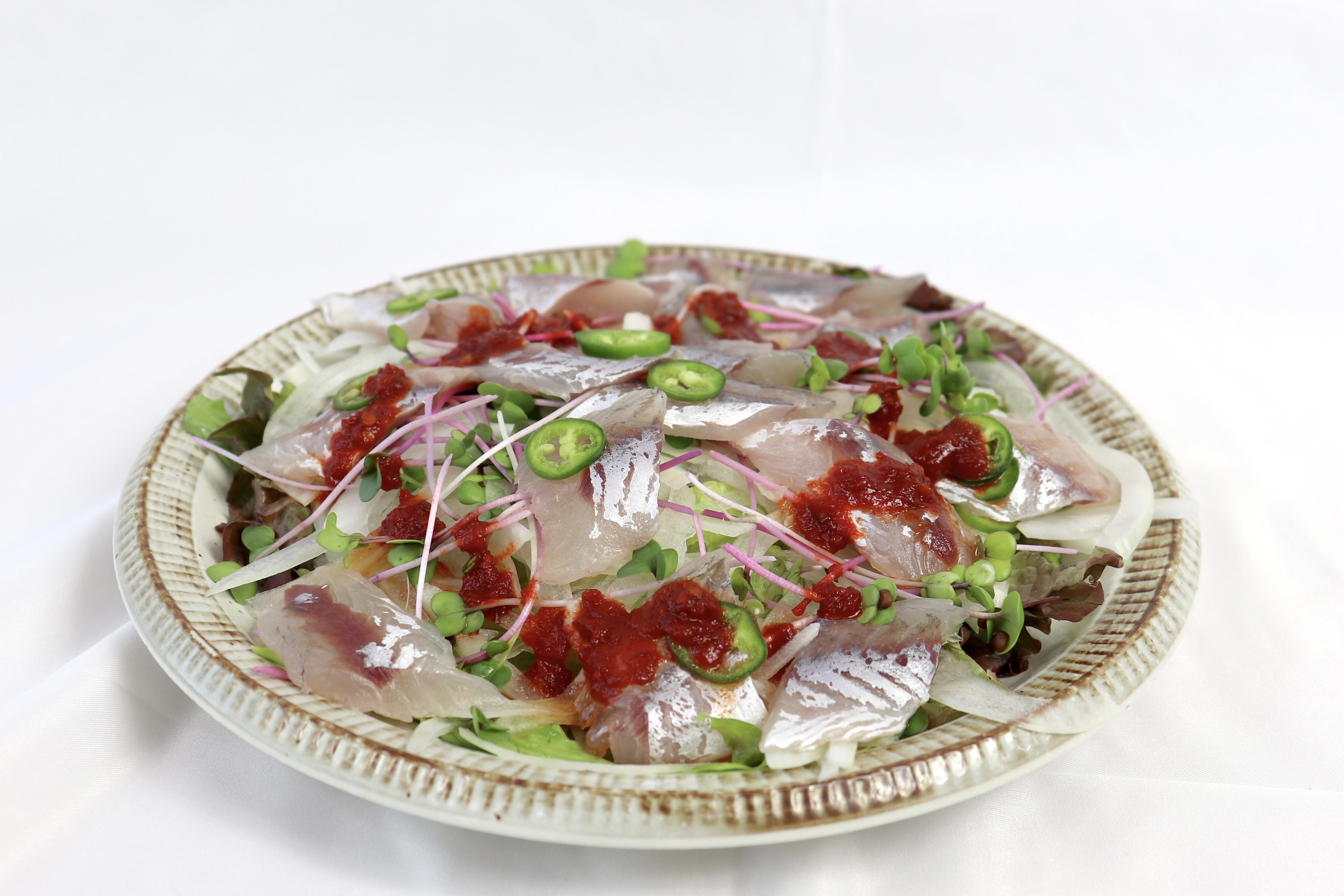 カマスのカルパッチョに激辛デスソースをかけた激辛メニューです。