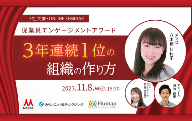 みらいコンサルティンググループ(本社:東京都中央区、代表:久保 光雄 岡⽥ 烈司)は、セミナー『~従業員エンゲージメントアワード3年連続1位の組織の作り方』を2023年11月8日にWEBにて開催いたします。
