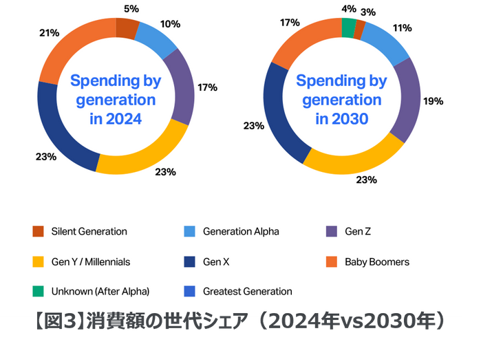 現在、Z世代は世界の消費総額(57兆6,000億ドル)の約17%を占め、今後6年でその割合は19%に達すると予測されています(図3)。