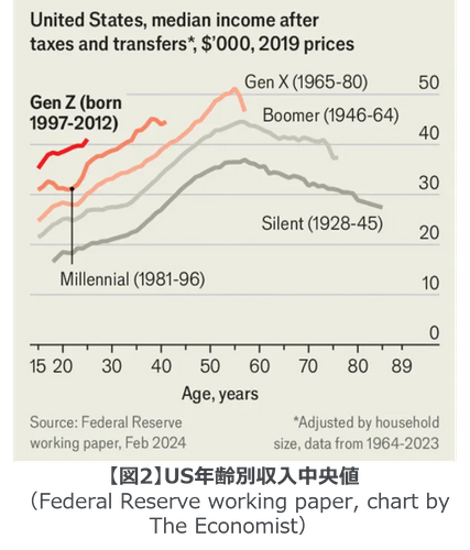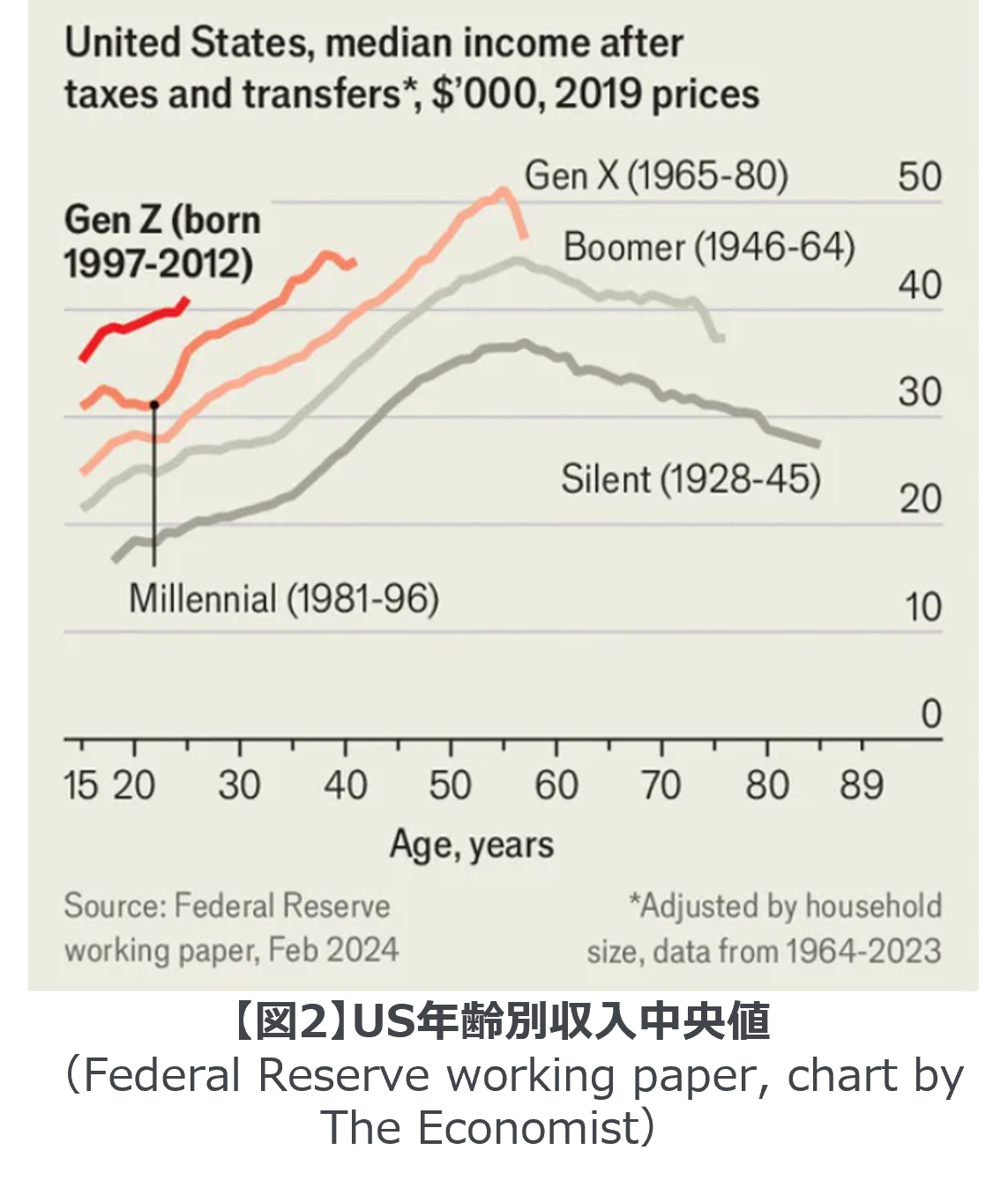 Z世代は、かつてないほど裕福な世代でもあります。例えば、アメリカの25歳の平均世帯年収は4万ドルを超え、これは(税金、政府移転支出、インフレを考慮しても)ミレニアル世代やベビーブーマー世代の同年齢と比べて大幅に高い水準です(図2)。