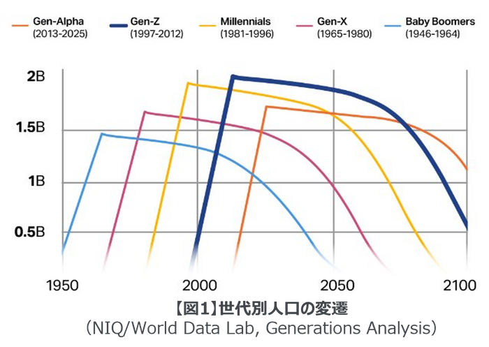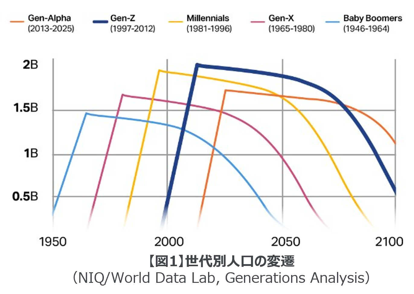 Z世代(Generation Z, Gen Z)は、1990年代後半から2010年初頭に生まれた世代を指します。2024年時点で12~27歳前後のこの世代は、消費行動の新しい潮流を形成し、今後のマーケティング戦略において最重要なターゲット層と見なされています。全世界人口の約25%を占め20億人に達するZ世代は、今後50年にわたって市場で最大の消費者層となることが予測されています(図1)。