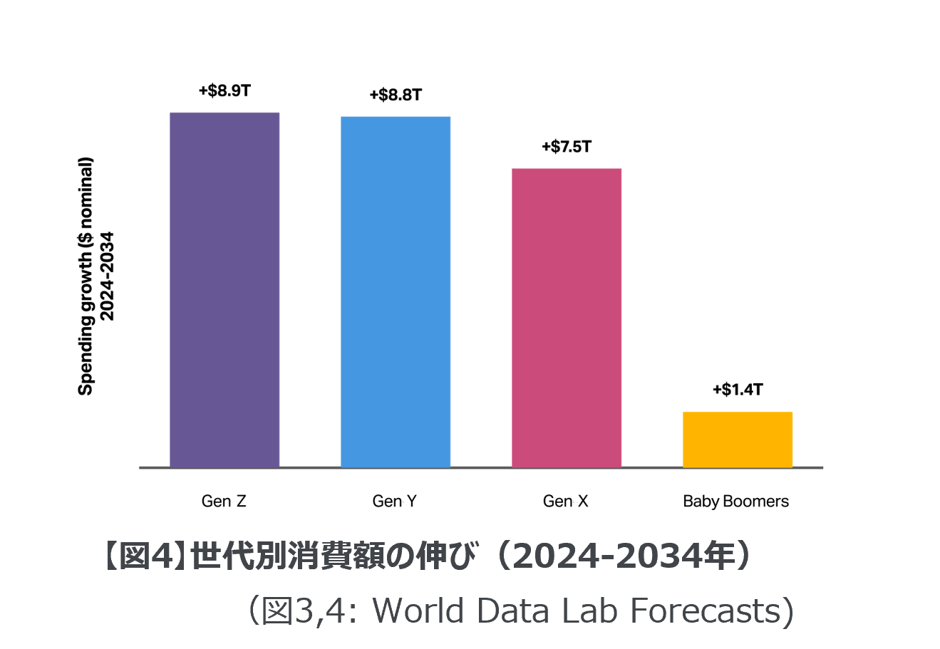 また、今後10年間で最も消費額の伸びが顕著な世代となるとされています(図4)。このような背景から、Z世代の消費動向を理解し、迅速に対応することが、企業にとってますます重要な課題となっています。