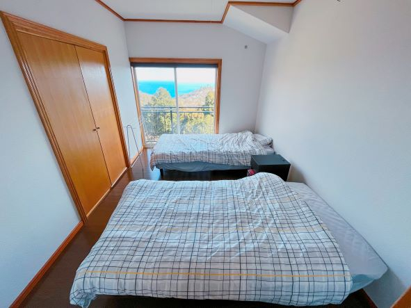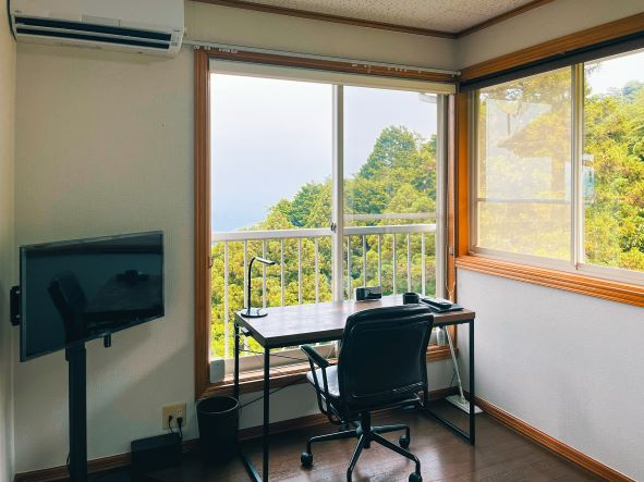 シングルベッドがある2階の洋室からも緑豊かな自然と海の眺望が望め、気持ちの良い目覚めを実現します。書斎部屋には景色が目の前に広がるワーキングデスクがあり、開放的かつ落ち着いた作業空間で集中して執務に打ち込むことが可能です。1階の和室はYogibo・漫画・プロジェクターが設置されており、全身をリラックスさせながら娯楽を楽しむことができる夢のようなお部屋となっています。
