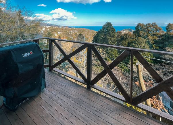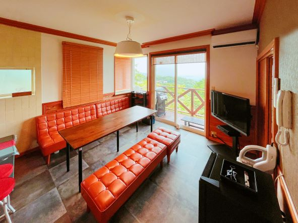 リフォーム済みの内装・新調された家具により清潔感があり、景色を見ながら快適に団らんできる空間となっています。「換気扇付き照明」や「日本酒セラー」など特徴的な設備も魅力で、滞在中に楽しんでいただく要素となっています。リビングからはウッドデッキに繋がっており、外気と一緒に絶景を堪能いただけます。