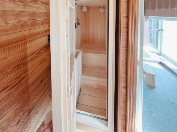 熱海の温泉が引かれた浴室。絶景を眺めながら贅沢に温泉を堪能できる、貴重なプライベート貸別荘となっています。また、作られたばかりの一人用サウナもあり、「別荘でととのう」という極上体験を味わうことができます。スイッチひとつで操作可能なサウナは、どなたでも安心して1人サウナに集中することが可能です。