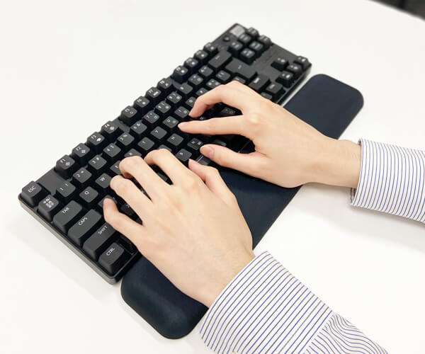パソコン工房セレクト商品『パームレスト』は、パソコン作業をしている手首が保護されて疲労軽減や長時間の作業がしやすくなります。パームレストをキーボードの手前に置き、手首をのせて利用します。長時間のキーボード操作をする方におすすめです。滑り止め加工で、サイズはテンキーレスサイズとフルキーボードサイズの2種類となります。