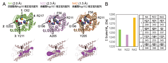 ●比較進化生理学的な手法と分子計算による細孔構造予測により、尿素・ホウ酸を透過しないタイプのAqp10の構造上の特徴を明らかにしました。