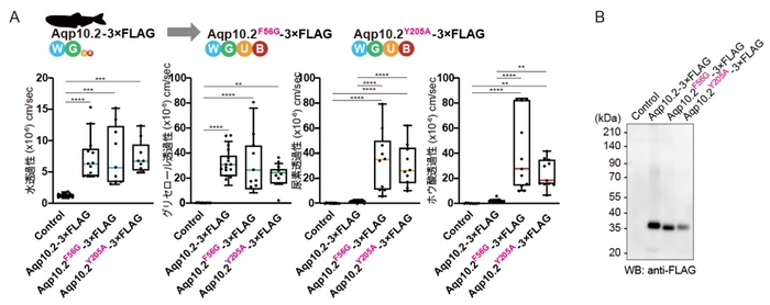 続いて、この可能性を実証するために、ゼブラフィッシュAqp10.2の変異体を作製し、その活性を解析しました。ゼブラフィッシュAqp10.2は、ar/R選択フィルターを形成するアミノ酸残基の1位と3位にフェニルアラニン残基(F)、チロシン残基(Y)といった大きなアミノ酸残基を持っています。そこでこれらを小さなアミノ酸残基であるグリシン残基(G)やアラニン残基(A)に置換した変異体をそれぞれ作製してアフリカツメガエル卵母細胞に発現させ、水、グリセロール、尿素、ホウ酸の透過性を測定しました。その結果、水とグリセロールの透過性は野生型と変異体のどちらも高いことが確認された一方、尿素・ホウ酸の透過性は野生型では低く、変異体では高いことが確認されました(図3)。これらの結果から、Aqp10.2のar/R選択フィルターを形成する1位と3位のアミノ酸残基の両方がかさ高いアミノ酸残基であることが、尿素・ホウ酸透過性を減弱させたり無くしたりするために必要であることが示されました。