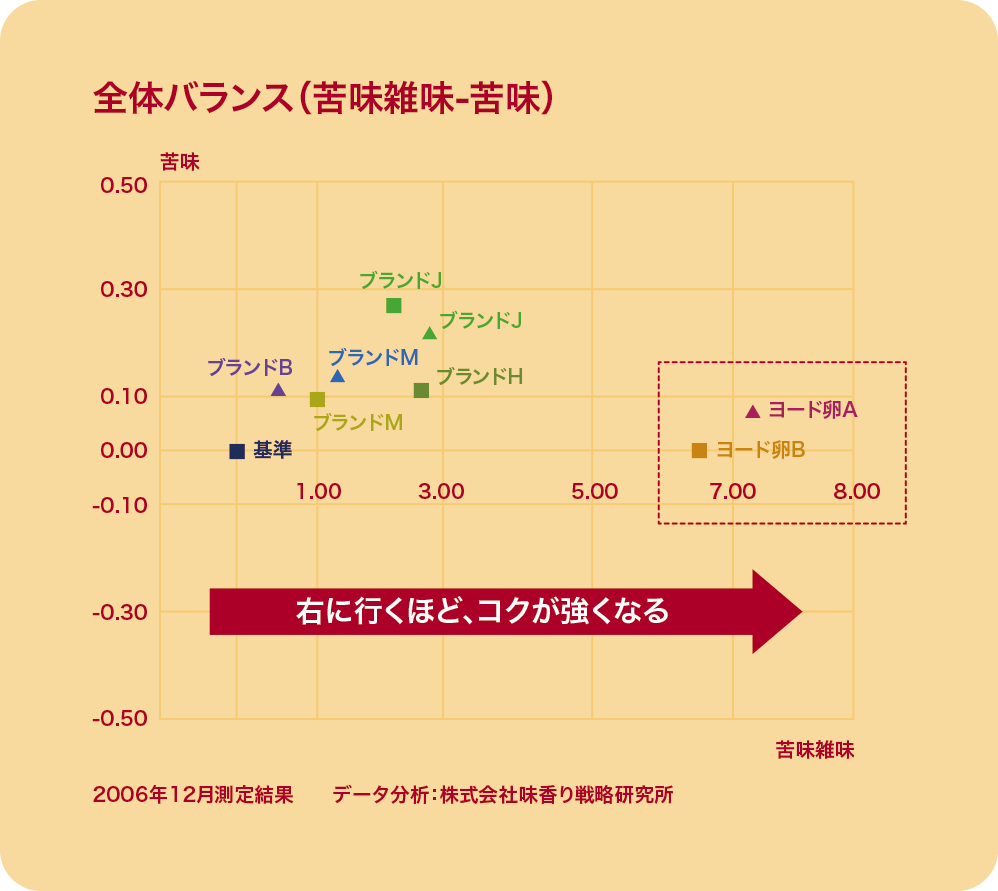 株式会社味香り戦略研究所での味覚センサーを用いた調査により、食べた時のコクは一般的な卵の平均値と比較して3.5倍以上であることが明らかになりました。たまごかけごはんや目玉焼きなど、卵の味わいをダイレクトに感じる料理で食べていただくとその違いをより実感できます。