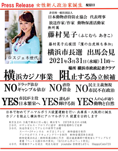 令和3年3月31日午前11時から横浜市役所で行われた藤村晃子さんの横浜市長選出馬表明記者会見にて応援ゲストとしてプロデューサーのGODとシータ波シンガーSIZUKUのユニット「GOD&SIZUKU」が登壇しました。