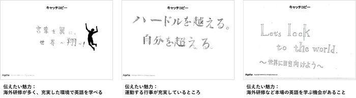 英語教育を魅力に設定した生徒は、英語のコピーをメインにしたり、バレーボール好きのターゲットに合わせて“横断幕”に使われる言葉を用いたキャッチコピーに仕上げたりと工夫を重ねました。また、運動行事の豊富さを魅力とした生徒のキャッチコピーは、ストイックに努力をすることで見える自分の成長を想像させるものとなりました。