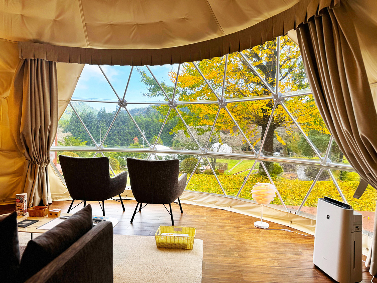・テント内から紅葉を眺めながら、手ぶらで快適にアウトドアを満喫