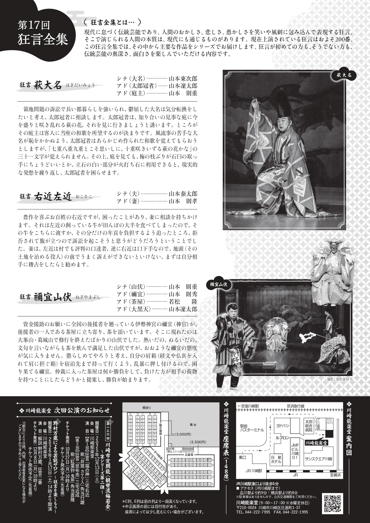 「萩大名」シテ(大名):山本東次郎、アド(太郎冠者):山本凜太郎、アド(庭主):山本 則重/「右近左近」シテ(夫):山本泰太郎、アド(妻):山本則孝/「禰宜山伏」シテ(山伏):山本則重、アド(禰宜):山本則秀、アド(茶屋):若松隆、アド(大黒天) 山本凜太郎