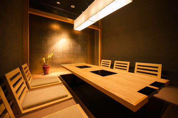 非日常の高揚感を感じられる空間づくりも、「やま中」のこだわりの一つです。銀座店は「老舗の味を王道の和空間で」 をコンセプトに、大人が特別な時間を過ごせる上質な空間をご用意しています。エントランスでお客様を迎えるのは、まる で老舗高級旅館のようなラグジュアリーなロビー。地下へと続く内階段が広々とした客席フロアへと導きます。それぞれしつ らえの異なる個室も5室備え、もつ鍋=B級グルメのイメージをくつがえす、「ひとつ上」のもつ鍋体験を提供いたします。