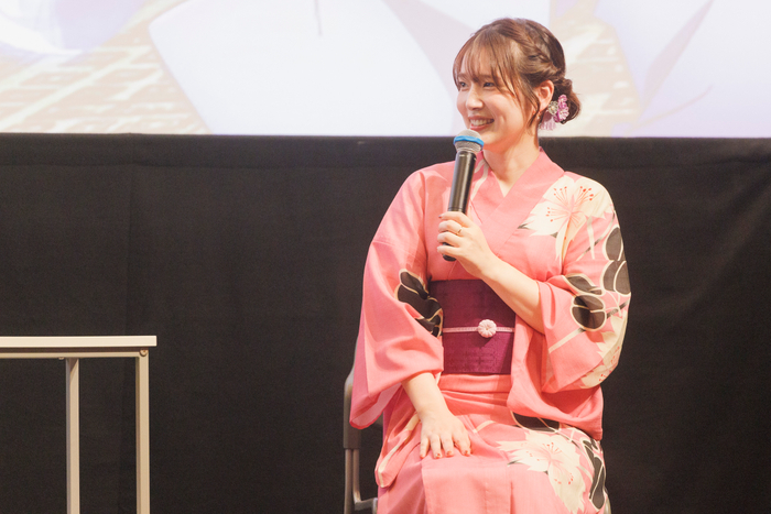 第1話と第2話の上映が終わり興奮冷めやらぬ中、司会進行を務める木村さんがステージに登場すると、そのままキャスト陣のトークショーへ突入。この日は登壇キャスト全員が、作品の世界観とリンクした浴衣で登場し、華やかな姿に客席からは思わず歓声が上がった。