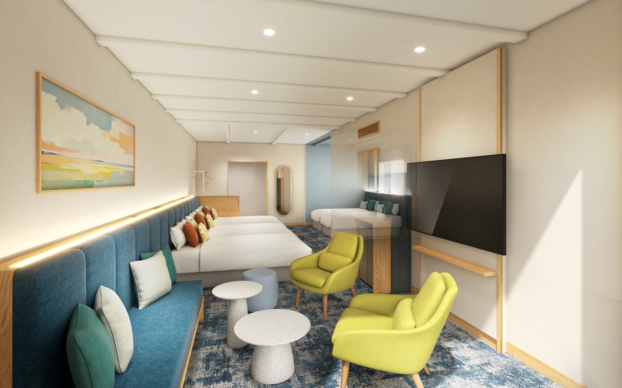 スペイン語で「太陽の海岸」を意味する南スペインのリゾート地「コスタ・デル・ソル」をモチーフにした、海の「青」と太陽の「黄色」を基調とした内装です。大人数で一堂に会して賑やかに楽しめるリビングスペースや、6人分の洋服や荷物をまとめられるバゲッジスペースなども完備。
