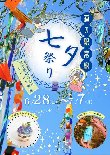 2025年7月5日(土)、6日(日)、7日(月)に道の駅常総で七夕祭りを開催します!星に見立てた金平糖のつかみどりや、色鮮やかなカップケーキや海鮮丼など常総の美味しいグルメやイベント、美味しいスイーツで楽しい思い出を作りませんか?6月28日から七夕祭りの先行イベントとして、店内出口側に笹を設置します。ご来店いただいたお客様の願いを短冊に書いていただき笹に飾っていただけたらと考えております。