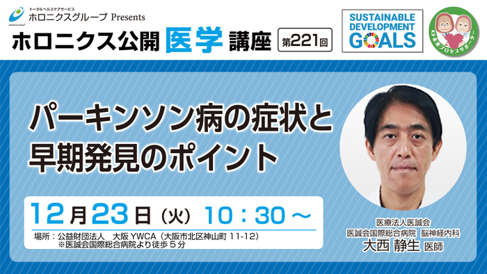 医療法人医誠会(本社:大阪府大阪市、代表者:谷 幸治)は、パーキンソン病の初期症状や早期発見のポイントを学ぶ公開医学講座を、2025年12月23日に公益財団法人 大阪YWCA にて開催します。本講座は公益財団法人 大阪YWCAより依頼を受け、出張講座として実施いたします。