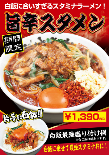 「旨辛スタメン」は、パンチのある味が白飯と相性抜群!ラーメンライスとして白飯をおいしく食べていただくために生み出したラーメンです。