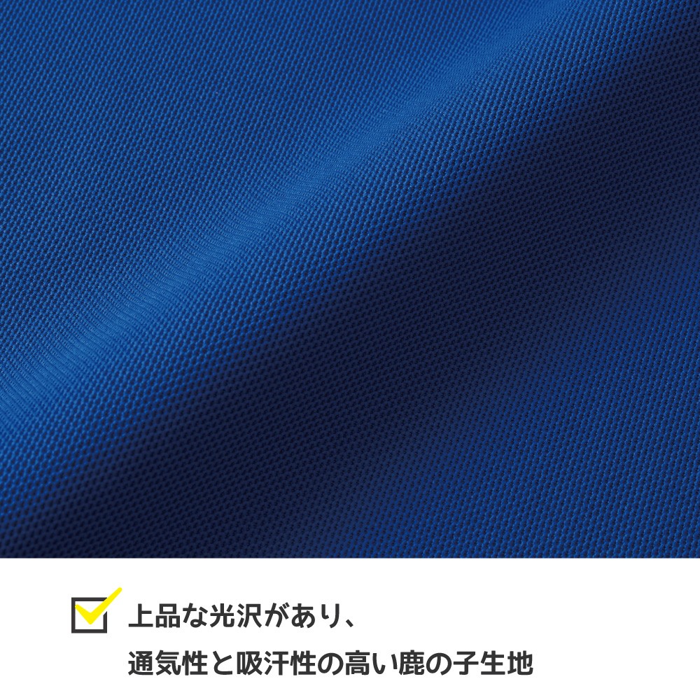 ポリエステル100%の鹿の子編み生地を採用。通気性と吸湿速乾性に優れ、汗をかいてもサラッと快適な状態をキープします。