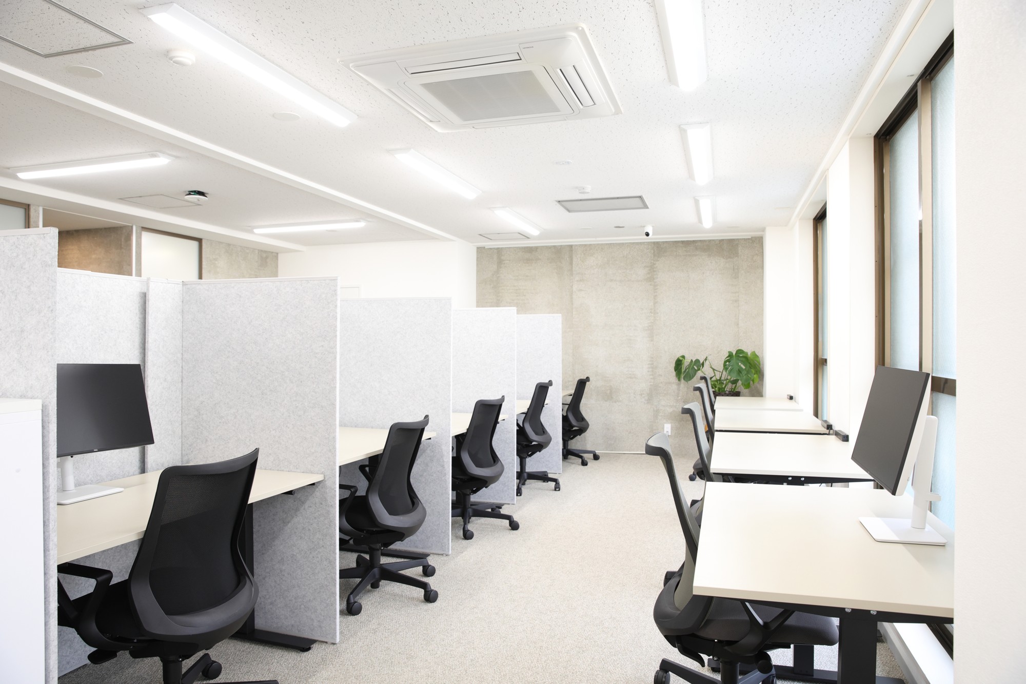 集中できる鍵付きの個室プランも、フリーアドレスのコワーキングプランもご用意しています。また、コワーキングエリアには大テーブルやパーティションを備えた集中できるワークテーブルを設置しています。