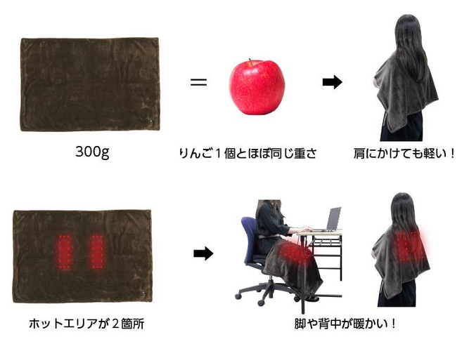 ユアサプライムスは、電源を気にせず“あたたかいを持ち歩ける”USB給電で温められるひざ掛けを2種類発売。