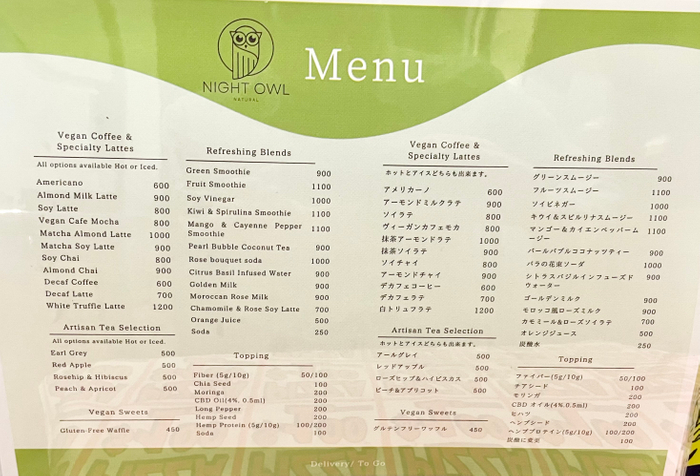 「ナイトオウル」のメニューには約30種類もの選択肢があり、その一つ一つがヴィーガンや無添加、デカフェなどにこだわり抜かれています。特におすすめのメニューには以下があります: