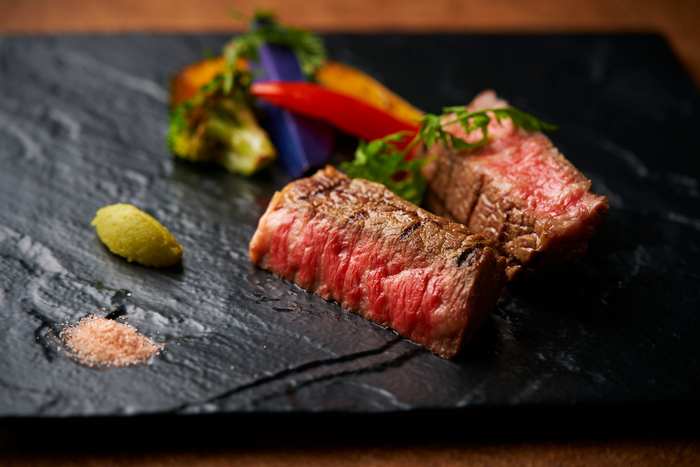 メインのお料理はリーベルホテルが自信を持ってお届けする、″鳥取県産黒毛和牛の炭火焼ステーキと旬野菜の石窯焼き″。肉の口溶けや風味に影響を与えるオレイン酸の割合が多い特徴を持つ鳥取和牛と、その旨味を最大限引き出す石窯での炭火焼調理法の組み合わせで、最上級のステーキに仕上げます。