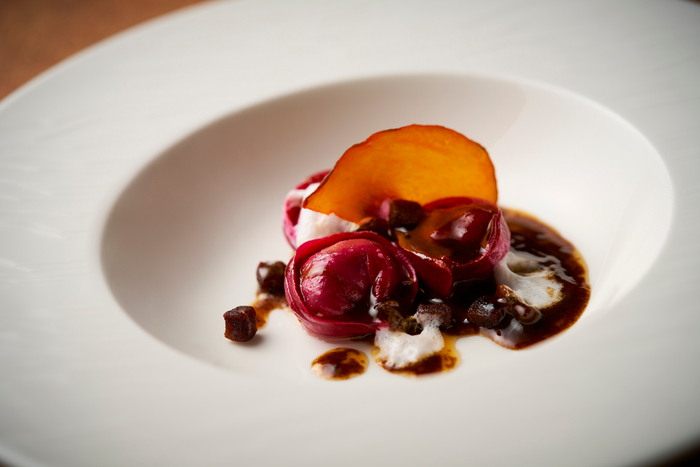 自家製のパスタ生地にはビーツが練り込まれており、鮮やかな赤と干し柿の橙色がグラデーションとなって、見た目にも美しい一皿に仕上がっています。