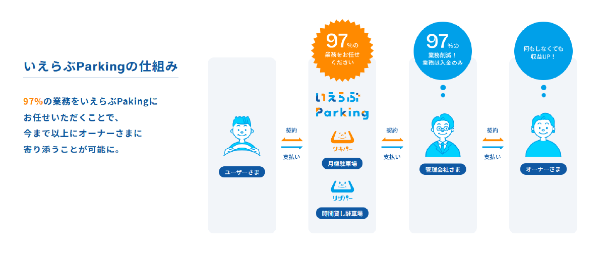 事業内容:駐車場契約管理業務代行サービスの企画・開発・運営、月極駐車場契約管理決済システム「ツキパー」、駐車場特化型ポータルサイト「いえらぶParking」、駐車場予約サービス「リザパー」