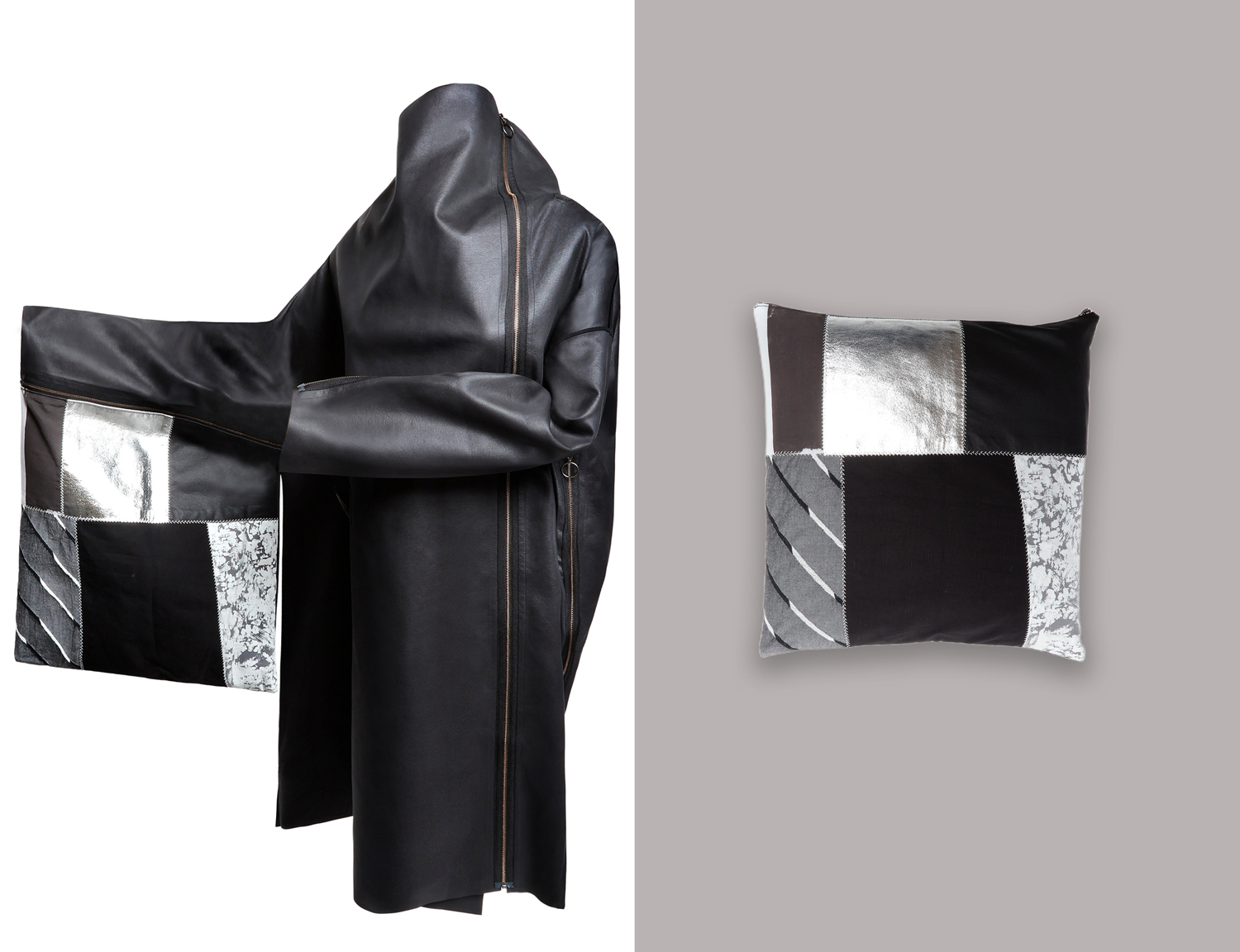 世界的なデザイン賞「DWA AWARD2021」を受賞したコートストール[登録意匠]は、ストールとしてはもちろん、ブルゾンやジレなどにも変化し6通りの着方が楽しめる、ブランドの人気アイテムのひとつ。従来のコートストールにキモノ袖パーツ[部分意匠出願中]をZIPで取り付けると着物用のコートに変化する「キモノ コートストール」のキモノ袖パーツとクッションカバーが共用できるアイデアです。