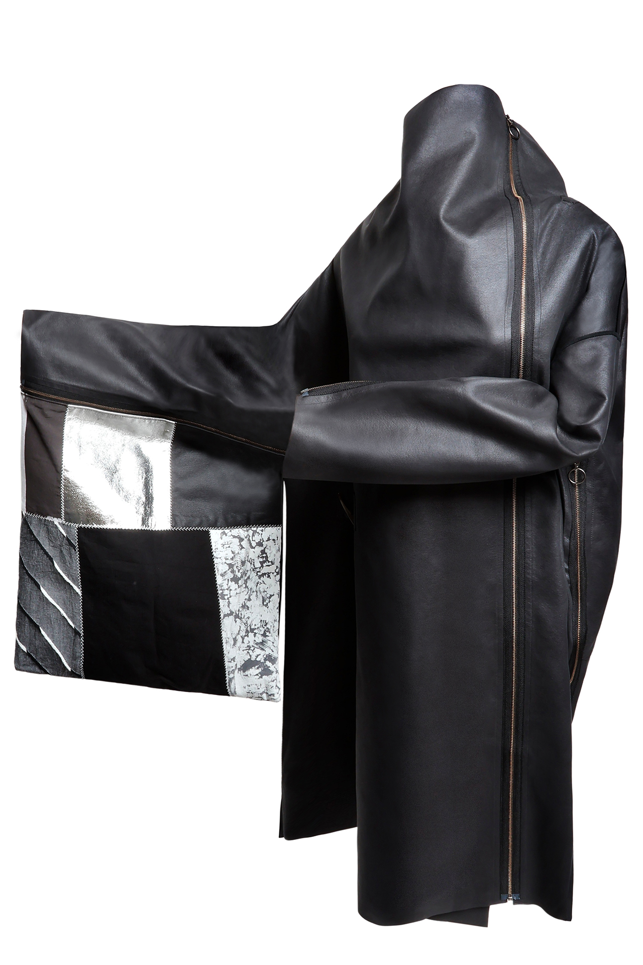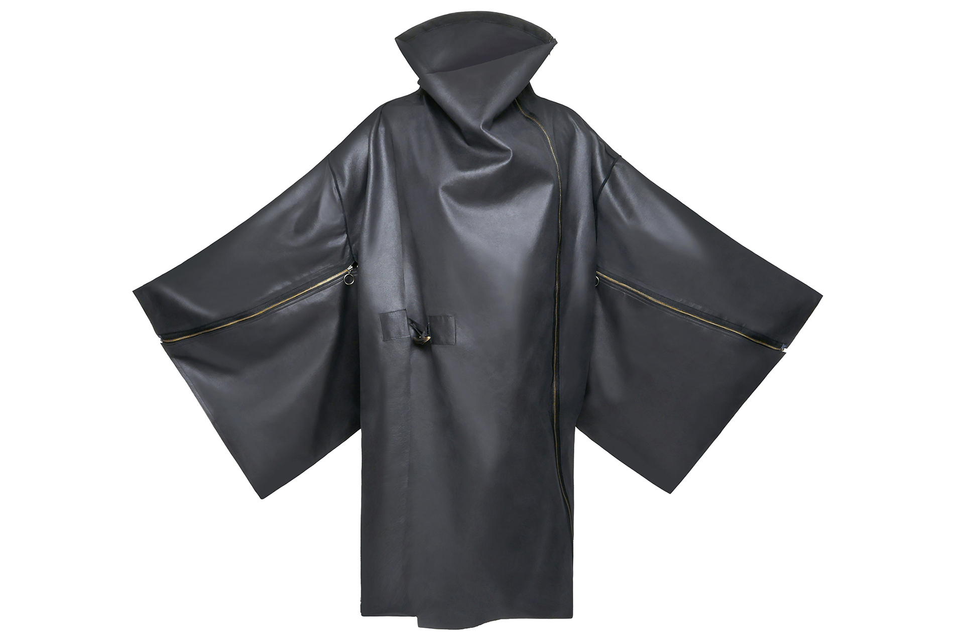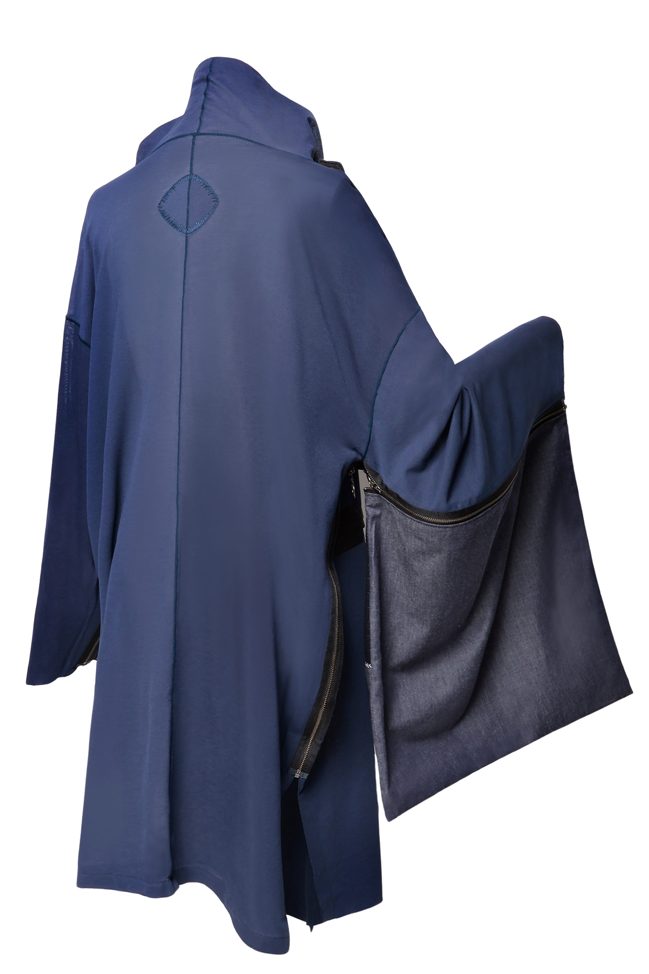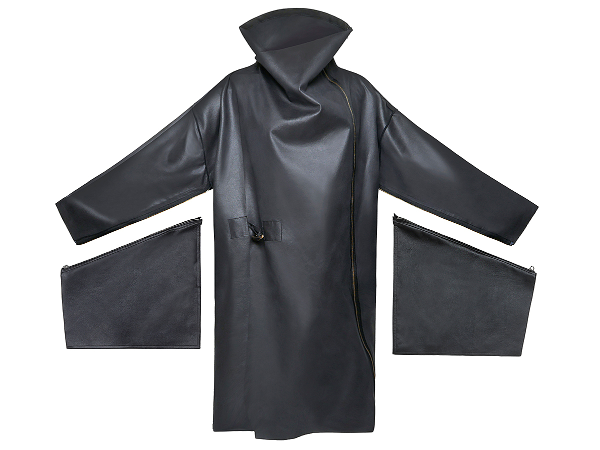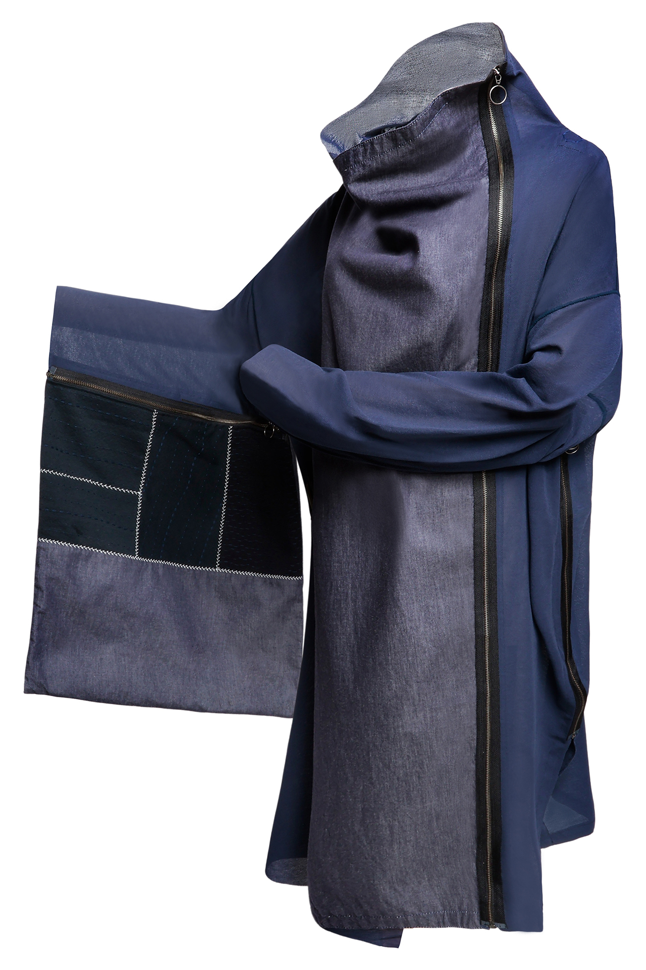 5つのZIPでコート、ブルゾン、ジレ、ストールなど、シーンにあわせて6通りに形を変えられるデザインが特徴。たたむとコンパクトなA4サイズになり、旅行にも便利なアイテムです。取り外し可能なフロントのオプションパネル(別売り)で変化は無限大です。登録意匠。