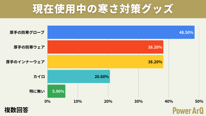 現在使用中の寒さ対策グッズは、「厚手の防寒グローブ」48.5%、「厚手の防寒ウェア」38.2%、「厚手のインナーウェア」38.2%、「カイロ」20.6%でした。「カイロを背中に貼っても1時間も持たない」「何枚も重ね着すると動きにくくて運転しづらい」といった不満の声も多く寄せられました。