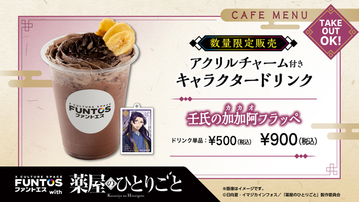 期間中(10/26~12/19)、アクリルチャーム付きドリンク900円(税込)、ドリンク単品500円(税込)にて提供いたします。