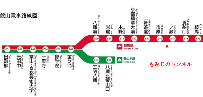 コース 出町柳駅==約30分==「もみじのトンネル」約3分停車(停まった列車から車窓を鑑賞)==鞍馬駅(折り返し)==二ノ瀬駅約5分停車(駅のもみじ鑑賞)==約25分==出町柳駅