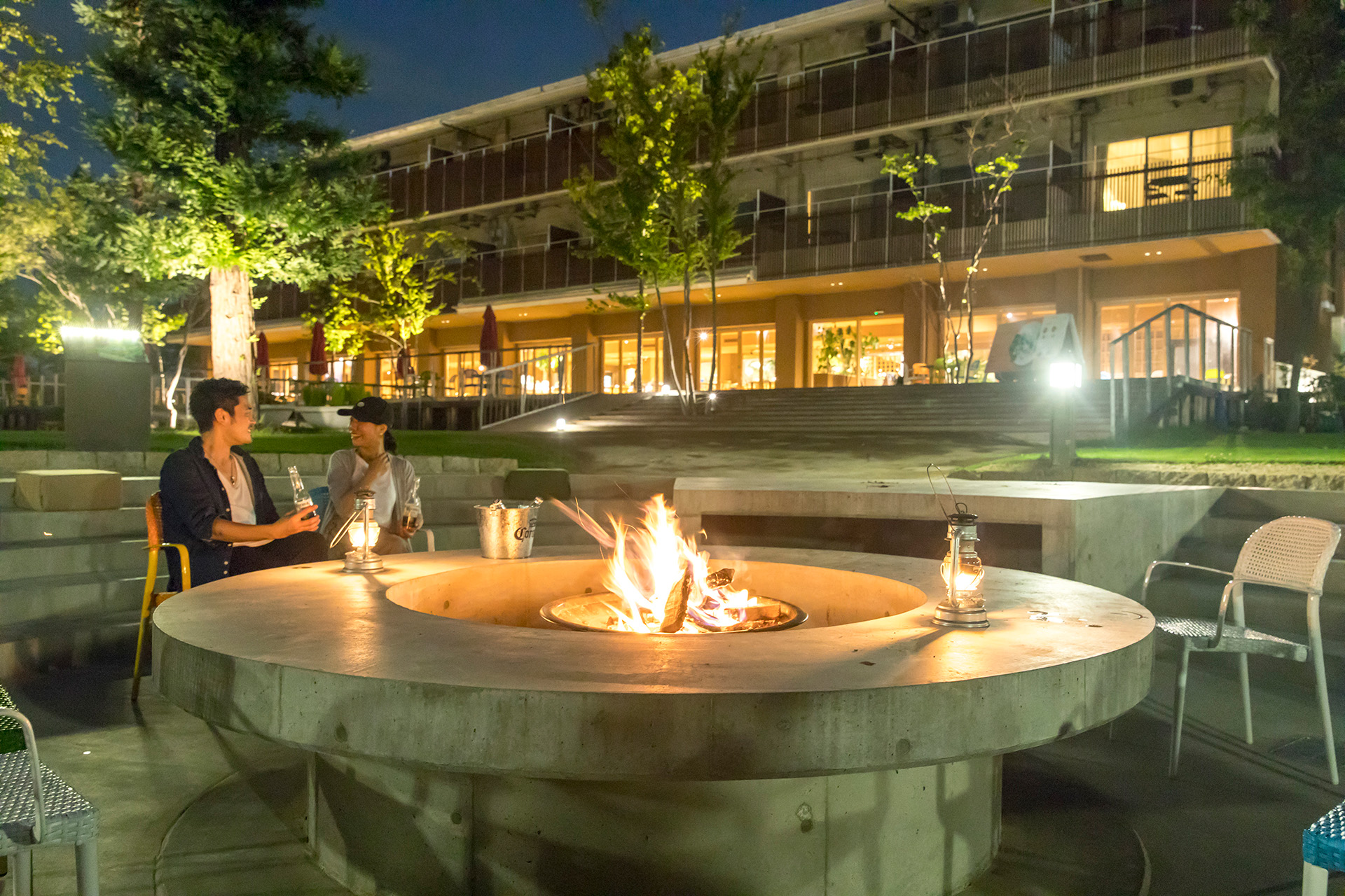 夜は庭園の宿泊者専用焚き火リビングで、ゆらめく火を囲みながらワインなどのお酒やドリンクを楽しめます。