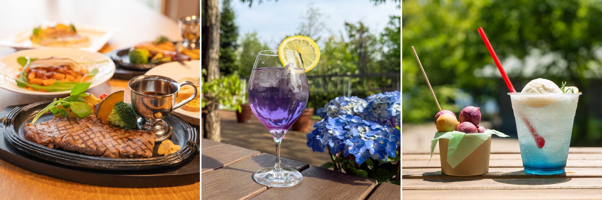 ガーデンテラスでのランチタイムは、写真映えも抜群。季節の彩りを楽しむハーフビュッフェと、あじさいをイメージしたオリジナルドリンクやスイーツをご用意します。
