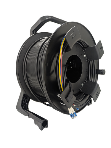 リールがセットになり、持ち運びやすくなった堅牢な光ケーブル。「イージーロバストケーブル」を使えば素早く簡単に光伝送路を構築可能です。