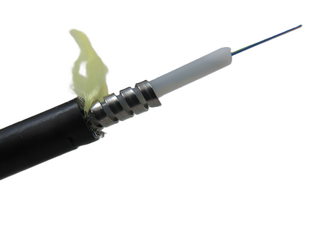 ロバスト光ケーブルはステンレスモノコイルを内蔵した光ケーブルで、自動車などの踏みつけや、小動物などによる噛みつき被害から、光ファイバの断線を防ぐ堅牢・丈夫さがあります。また防水タイプは、光ファイバの周りを白いPBTチューブが覆うことで、外被が破れた際にも水が光ファイバに届かないようになっています。光ファイバはシングルモード(SM)とマルチモード(OM3)がございます。