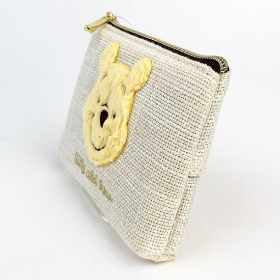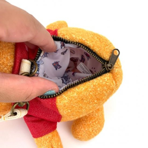 まずは全体像からご覧ください。ぬいぐるみのような立体的な造形のプーさんポーチです。普段のプーさんぬいぐるみとは少し違った色合いもポイント。優しい表情でこちらを見つめている、大人も欲しくなる可愛さのポーチとなっています。