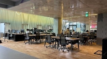 閉鎖的な大学の研究室のイメージを刷新したいと考え、物理的な垣根(壁)を取り除きました。学部生や大学院生、教員など様々な人が好きな時間に好きな場所で研究に取り組み、自然にディスカッションが生まれるような空間を創出します。